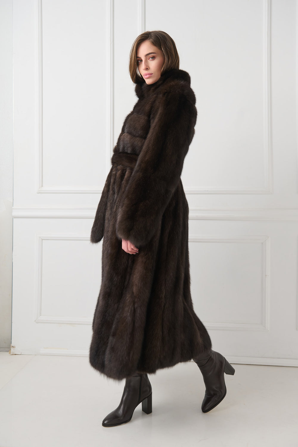 Manteau long en fourrure de sable avec ceinture. Le design présente des peaux horizontales sur le haut, ajoutant une structure douce aux épaules et à la poitrine. Sous la taille, la fourrure s'écoule en longues lignes verticales pour une silhouette élégante et flatteuse. Une ceinture en sable assortie souligne la taille et permet un ajustement plus personnalisé.
