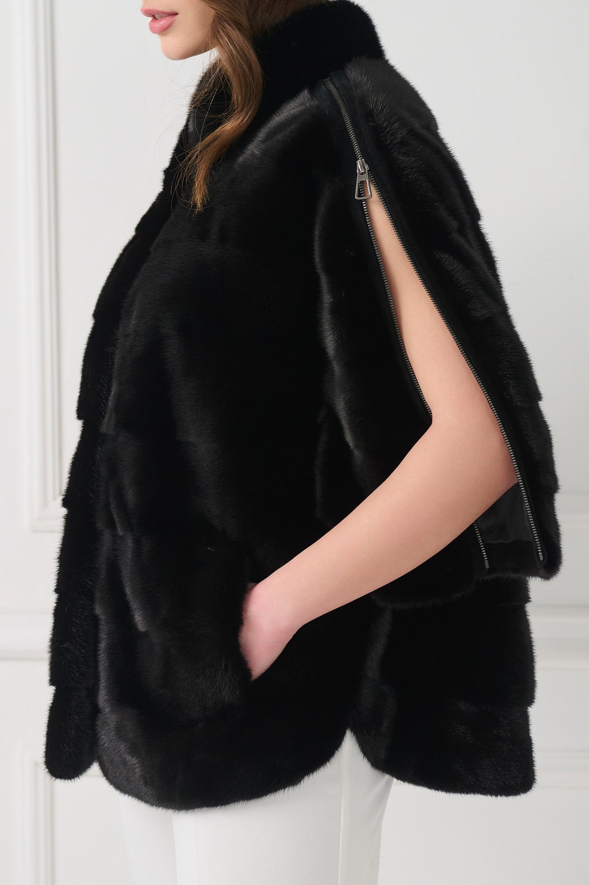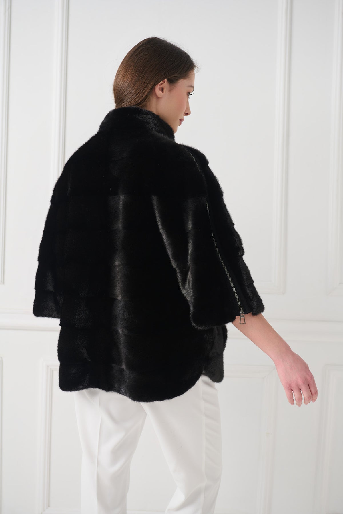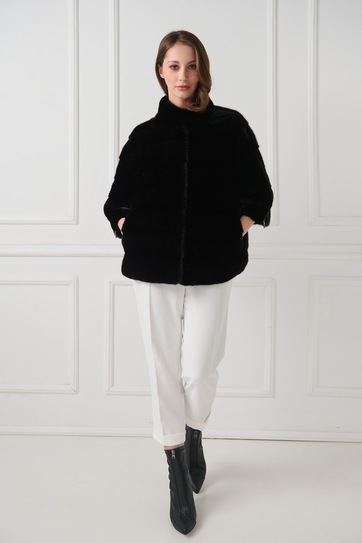 Giacca di visone contemporanea e raffinata. Le maniche corte sono dettagliate con eleganti aperture a zip, permettendo alle braccia di essere indossate aperte o chiuse per maggiore versatilità e movimento. Un colletto alto e pulito completa il look, conferendo al capo un carattere moderno ed elegante.
