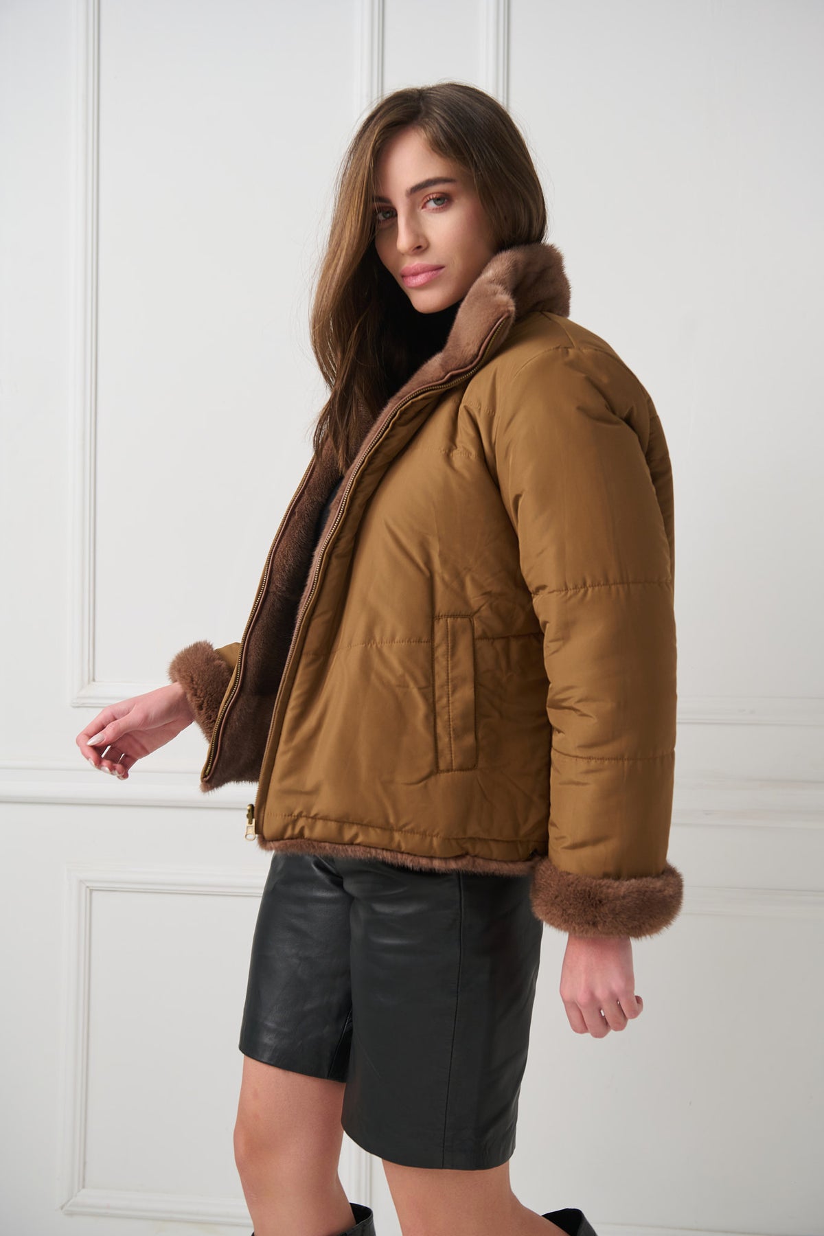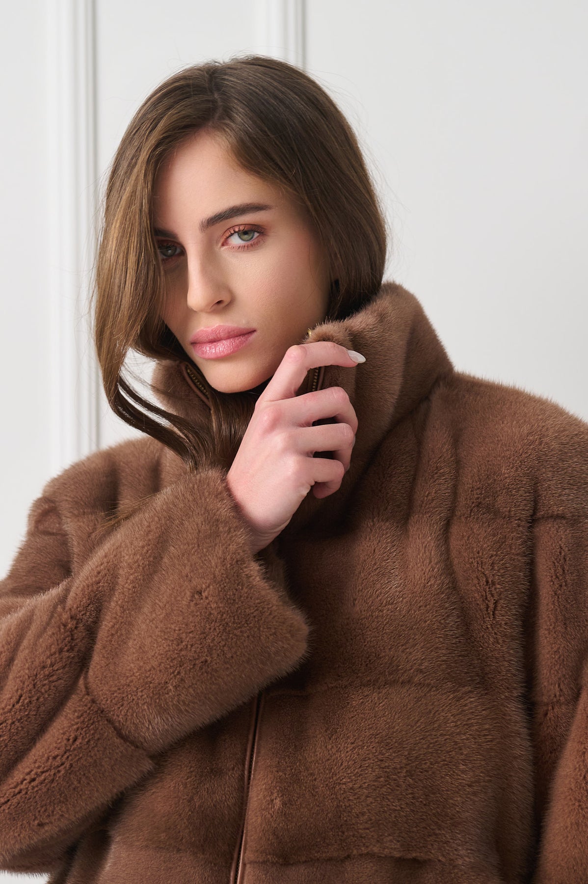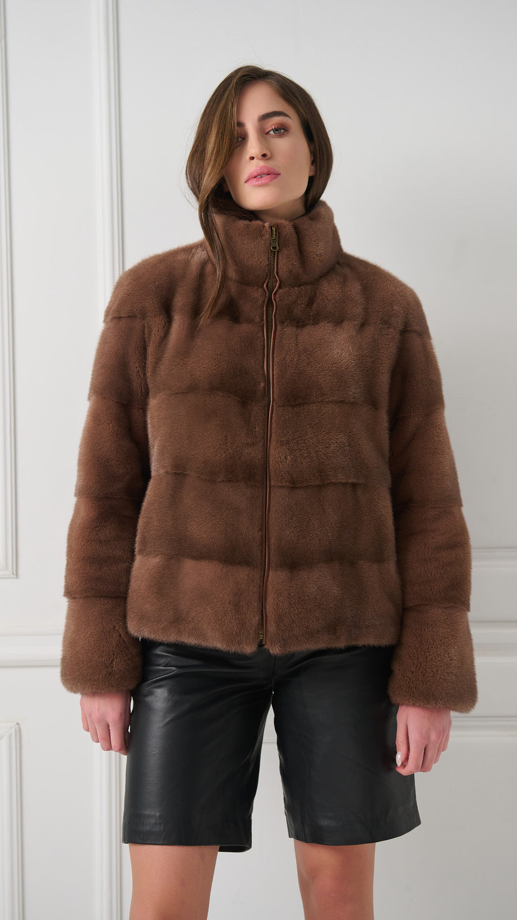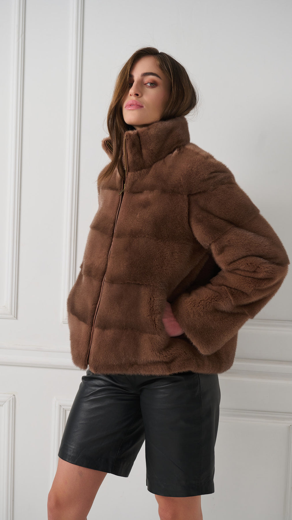 Giacca casual reversibile. Un lato è realizzato in morbido mink. Il lato opposto presenta un tessuto tecnico trapuntato, che aggiunge un tocco pratico e casual rendendo la giacca ideale per l'uso quotidiano. Un colletto alla coreana migliora comfort e struttura, mentre il taglio dritto mantiene l'aspetto pulito ed equilibrato.