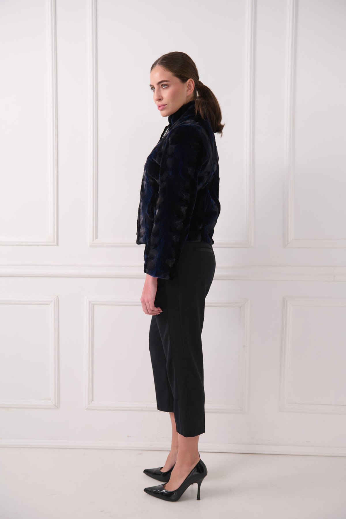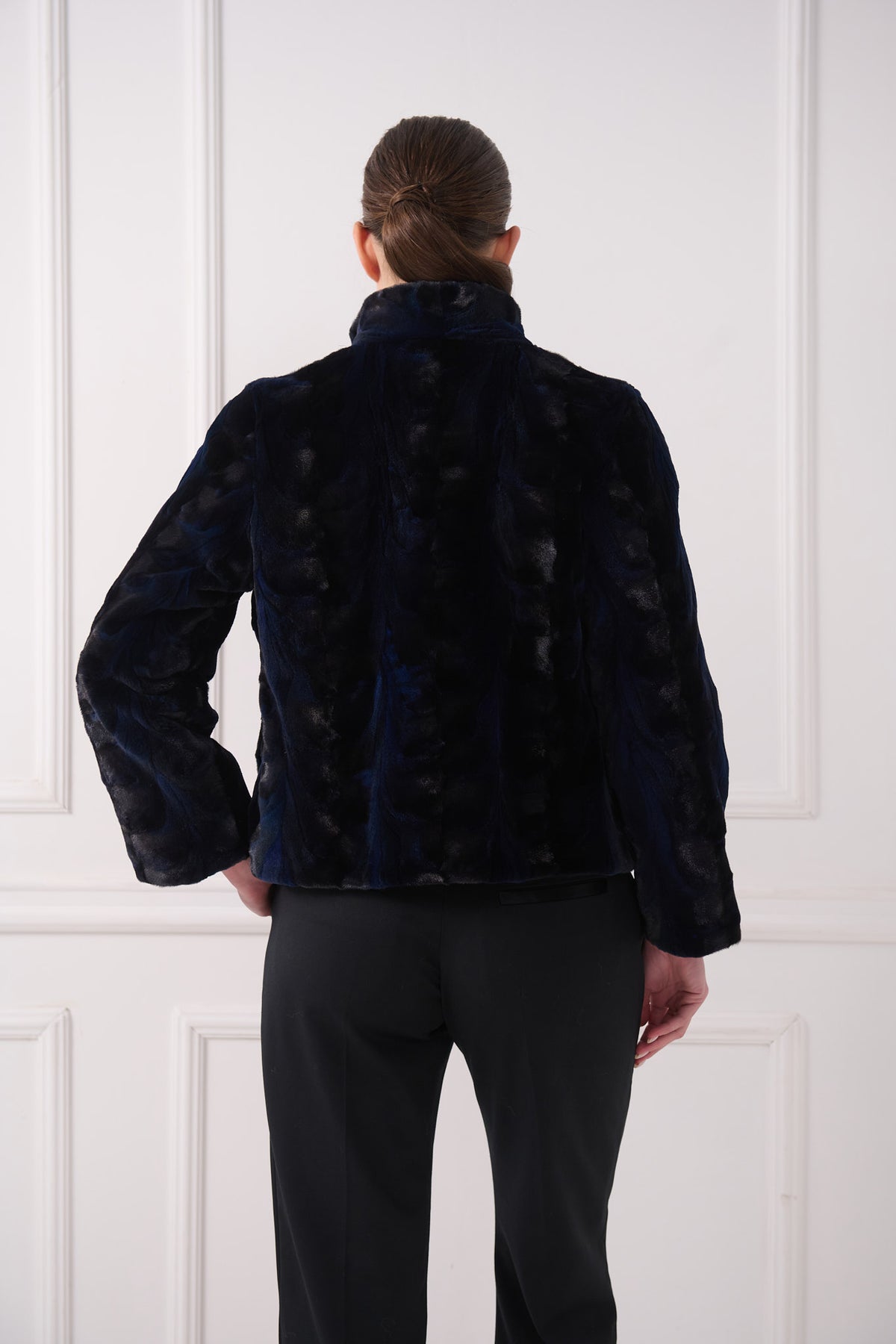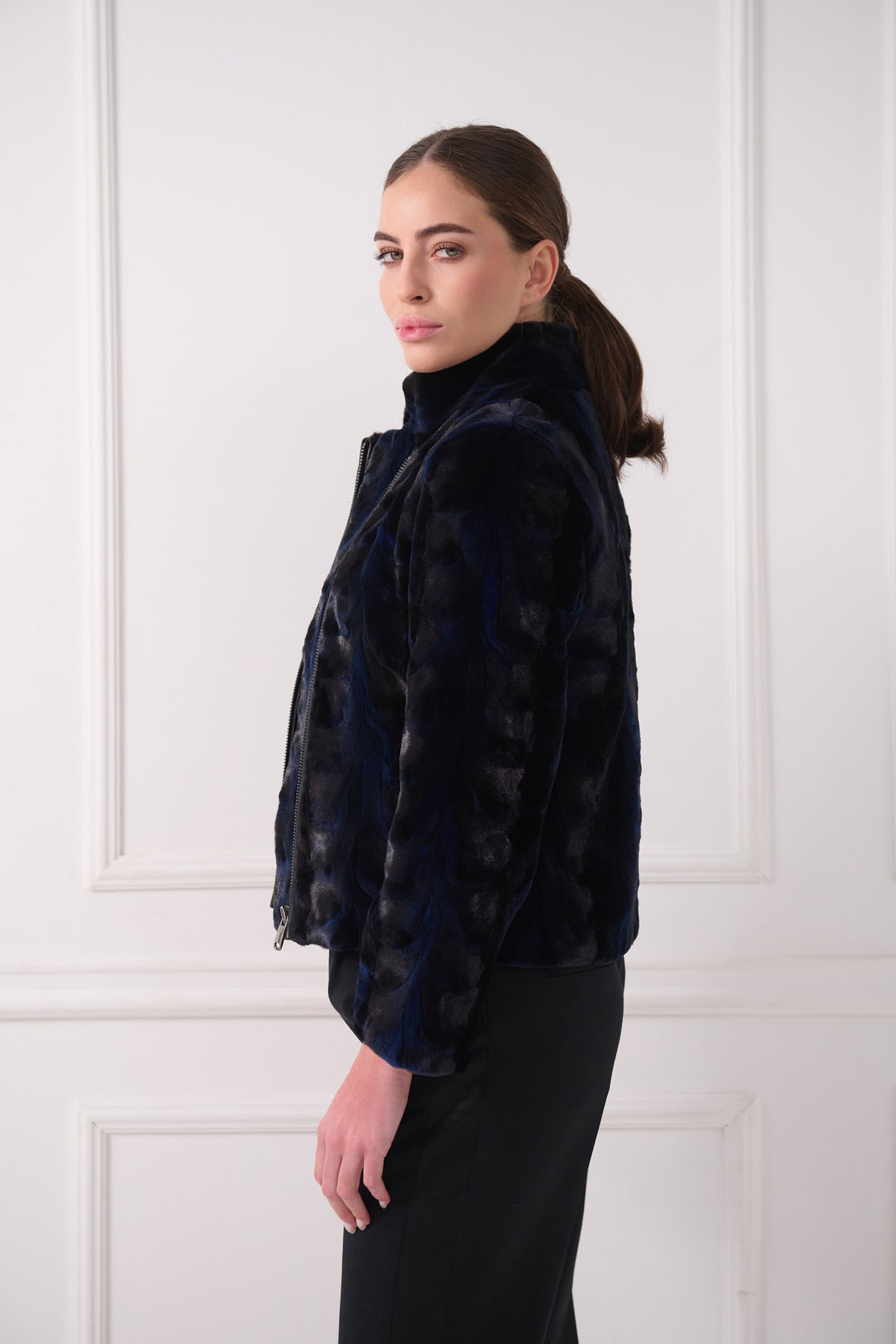 Giacca biker moderna in agnello persiano. La silhouette pulita e corta è bilanciata da un colletto strutturato a listino e da una zip frontale elegante, rendendola facile da abbinare sia per look da giorno che da sera.