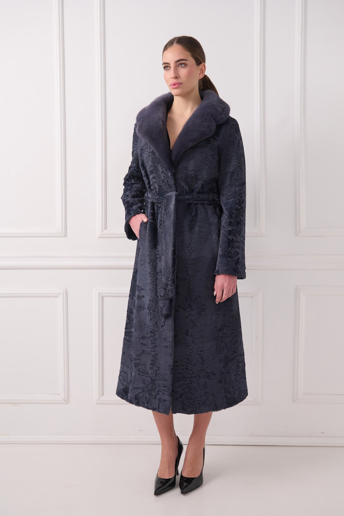 Questo cappotto lungo è realizzato in agnello persiano strutturato, evidenziato da un morbido colletto in visone che aggiunge calore e contrasto. La silhouette dritta è delicatamente definita da una cintura abbinata, creando un look equilibrato ed elegante adatto sia per l'uso quotidiano che per occasioni più raffinate.