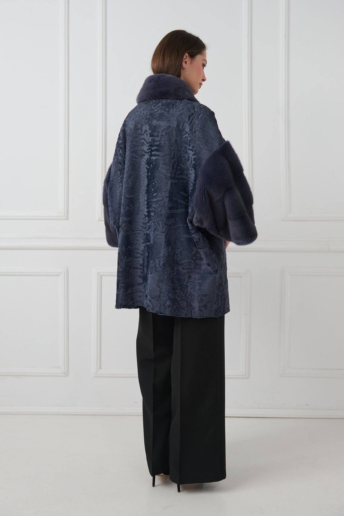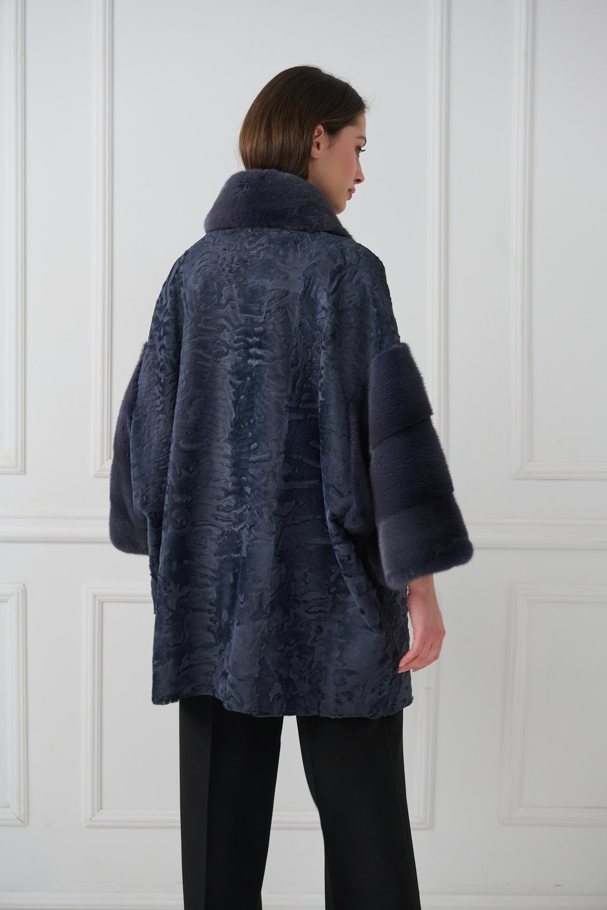 Cappotto sofisticato realizzato in agnello persiano riccamente testurizzato, evidenziato da raffinati dettagli in visone che aggiungono morbidezza e contrasto. Il design presenta una silhouette dritta e rilassata con un colletto in visone morbido e inserti coordinati in visone sulle maniche corte. Linee pulite e proporzioni equilibrate conferiscono al capo un fascino moderno ma senza tempo.