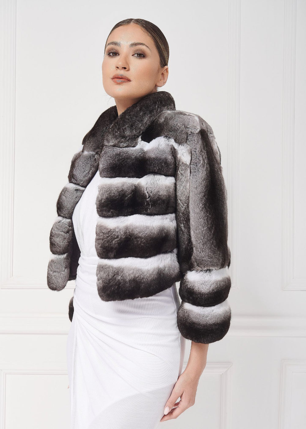 Изысканная короткая куртка из меха шиншиллы с высоким воротником.
