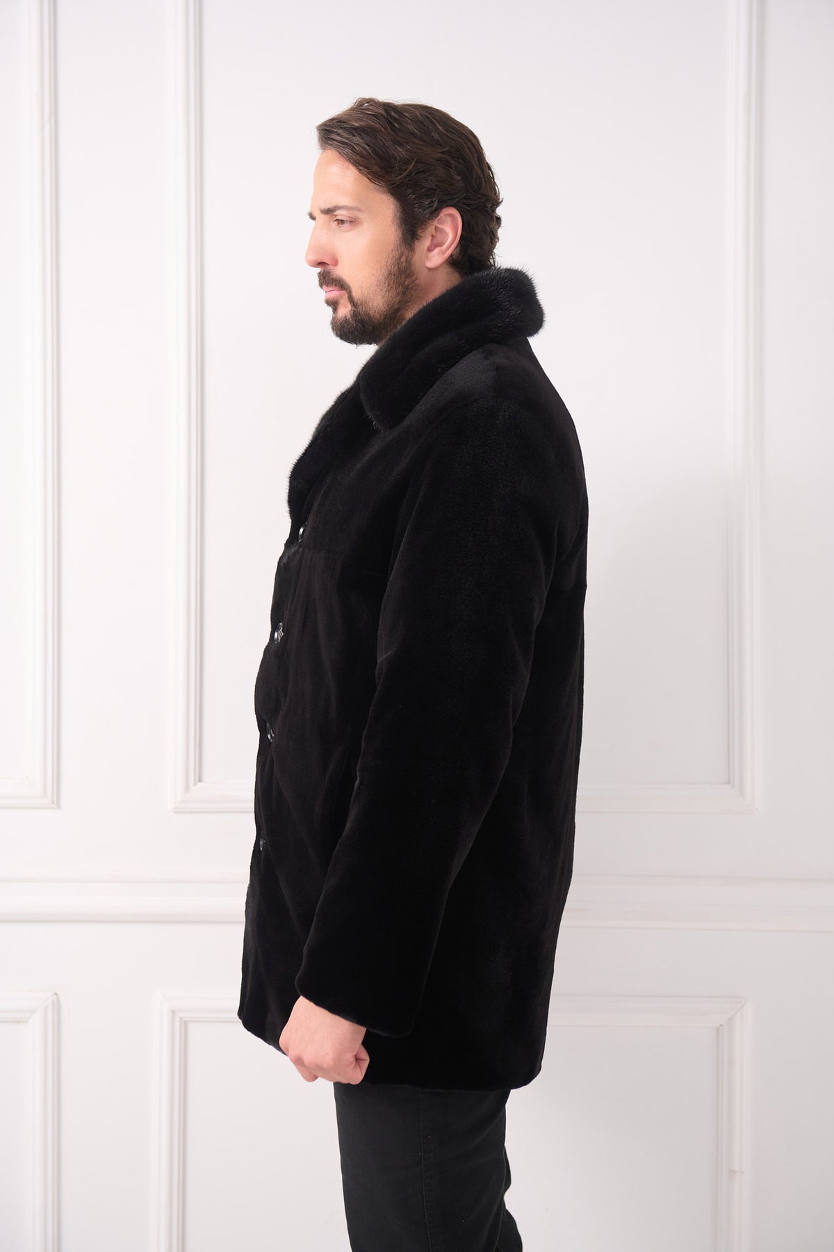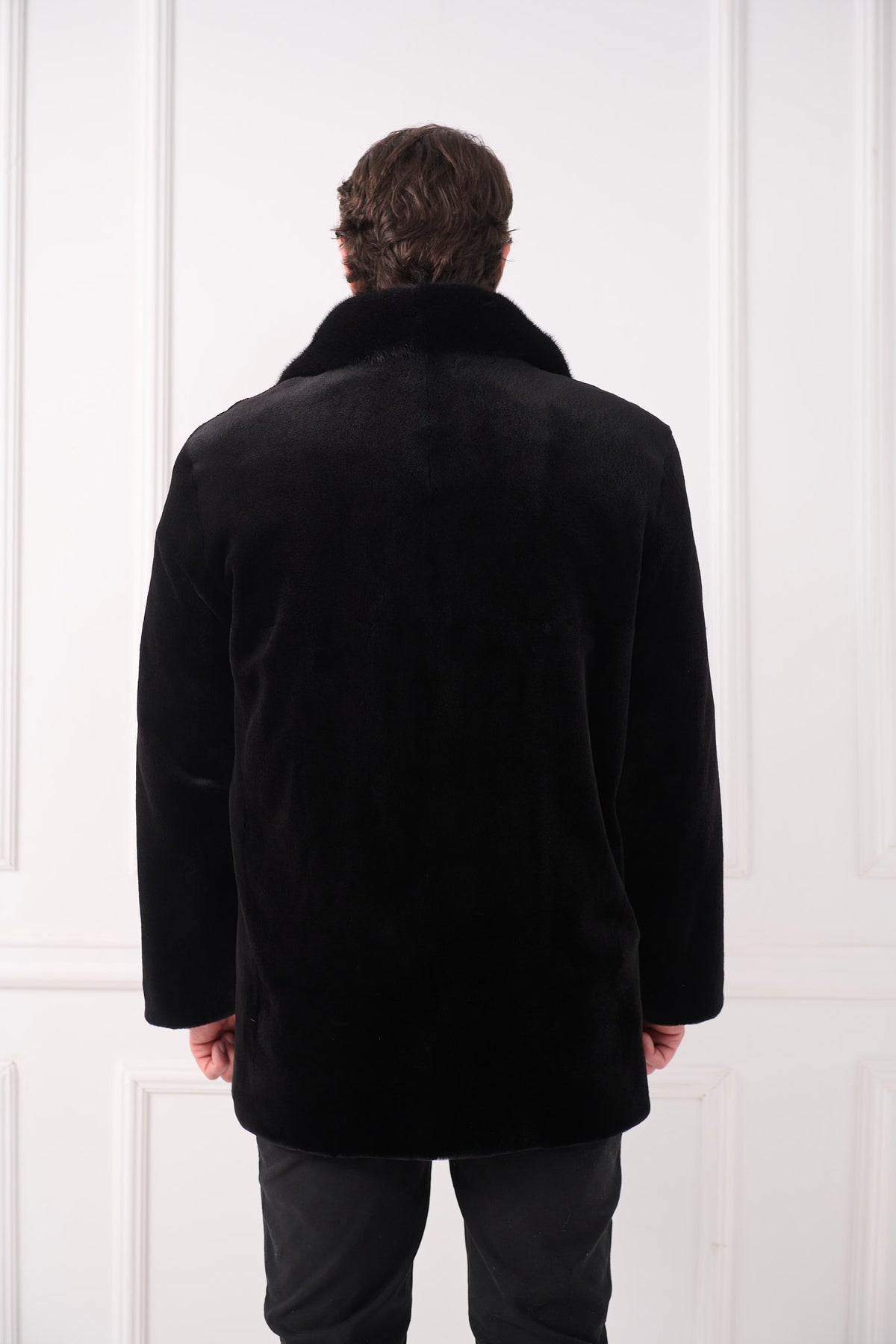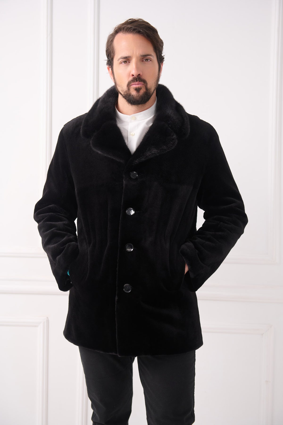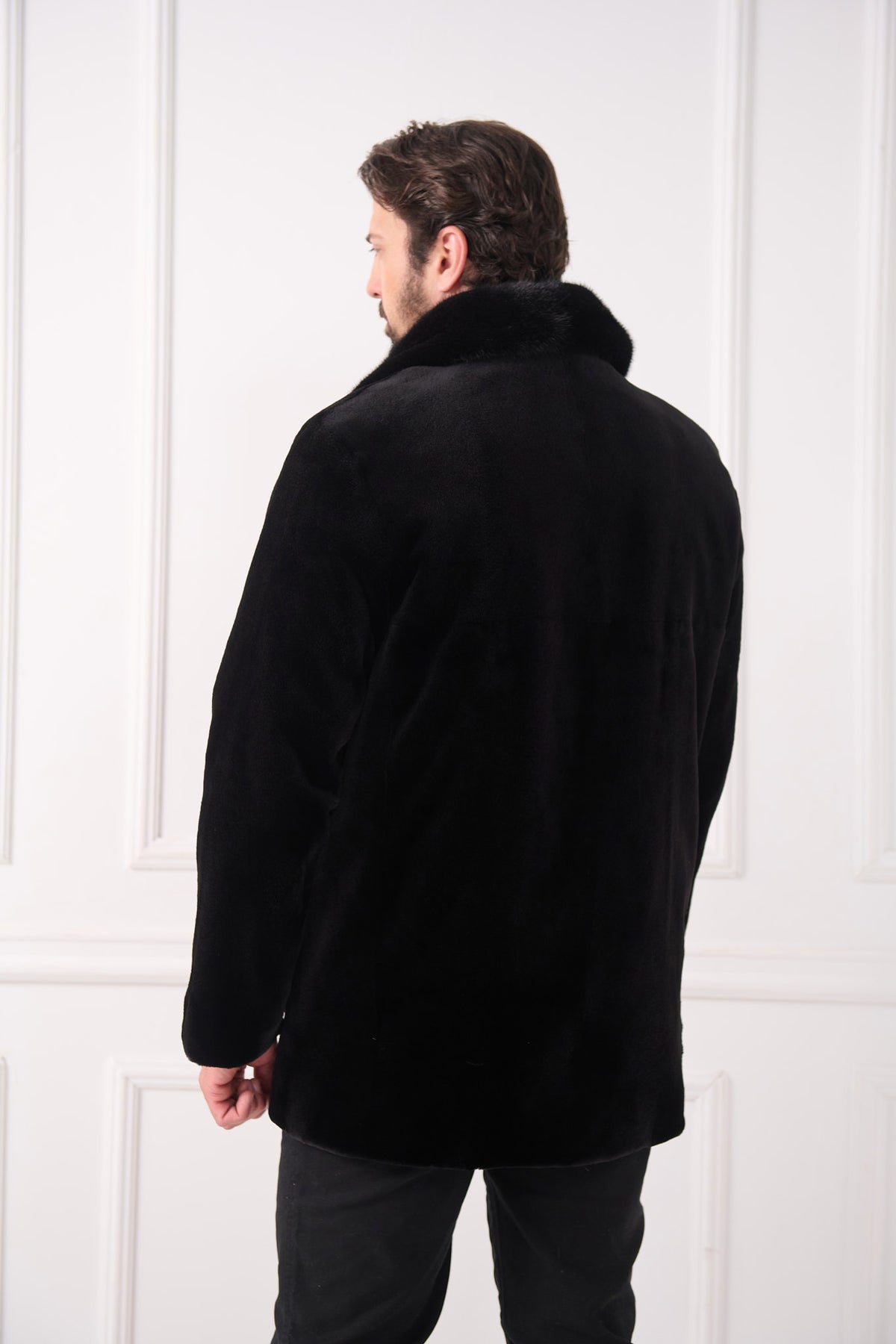 A timeless and elegant men’s jacket crafted from soft sheared mink, finished with a luxurious long hair mink collar for extra warmth and a refined look. The smooth sheared body gives the jacket a clean, modern appearance, while the fuller collar adds a touch of classic sophistication. Designed with comfort in mind, it features two practical pockets, a button closure, and a relaxed fit that is easy to wear every day.
